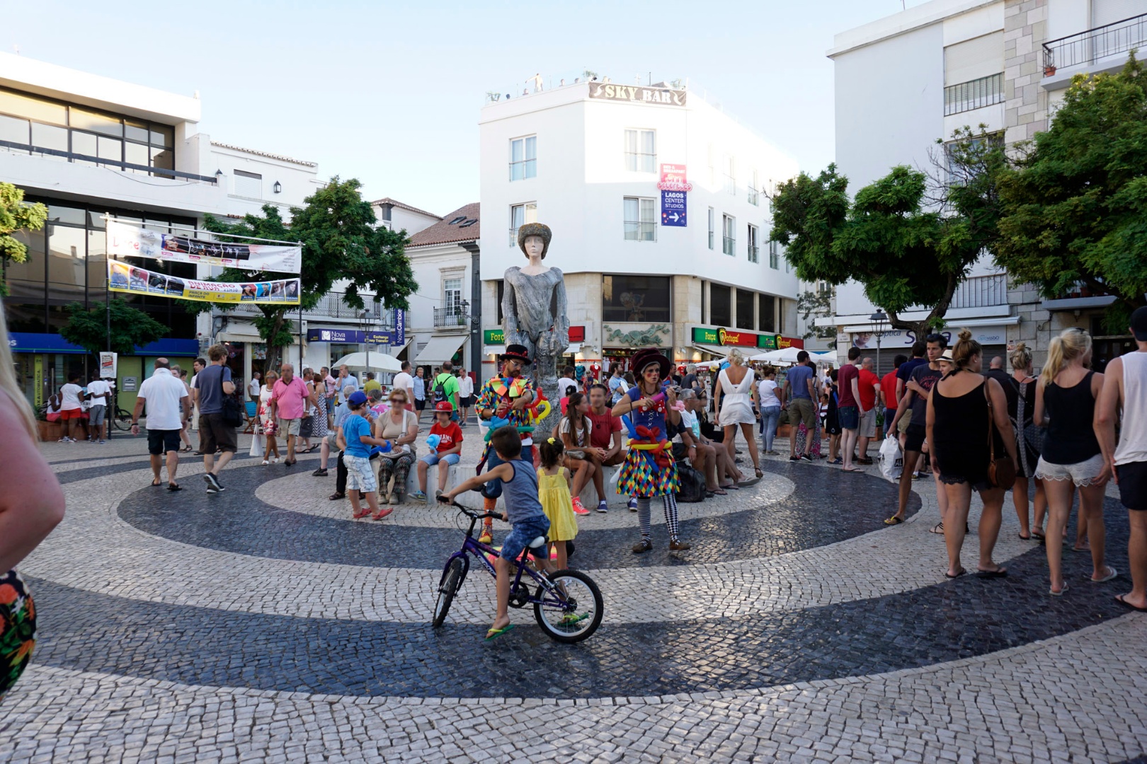 Aspecto da Praça Gil Eanes, no centro da cidade, com a habitual animação de Verão de um destino turístico.