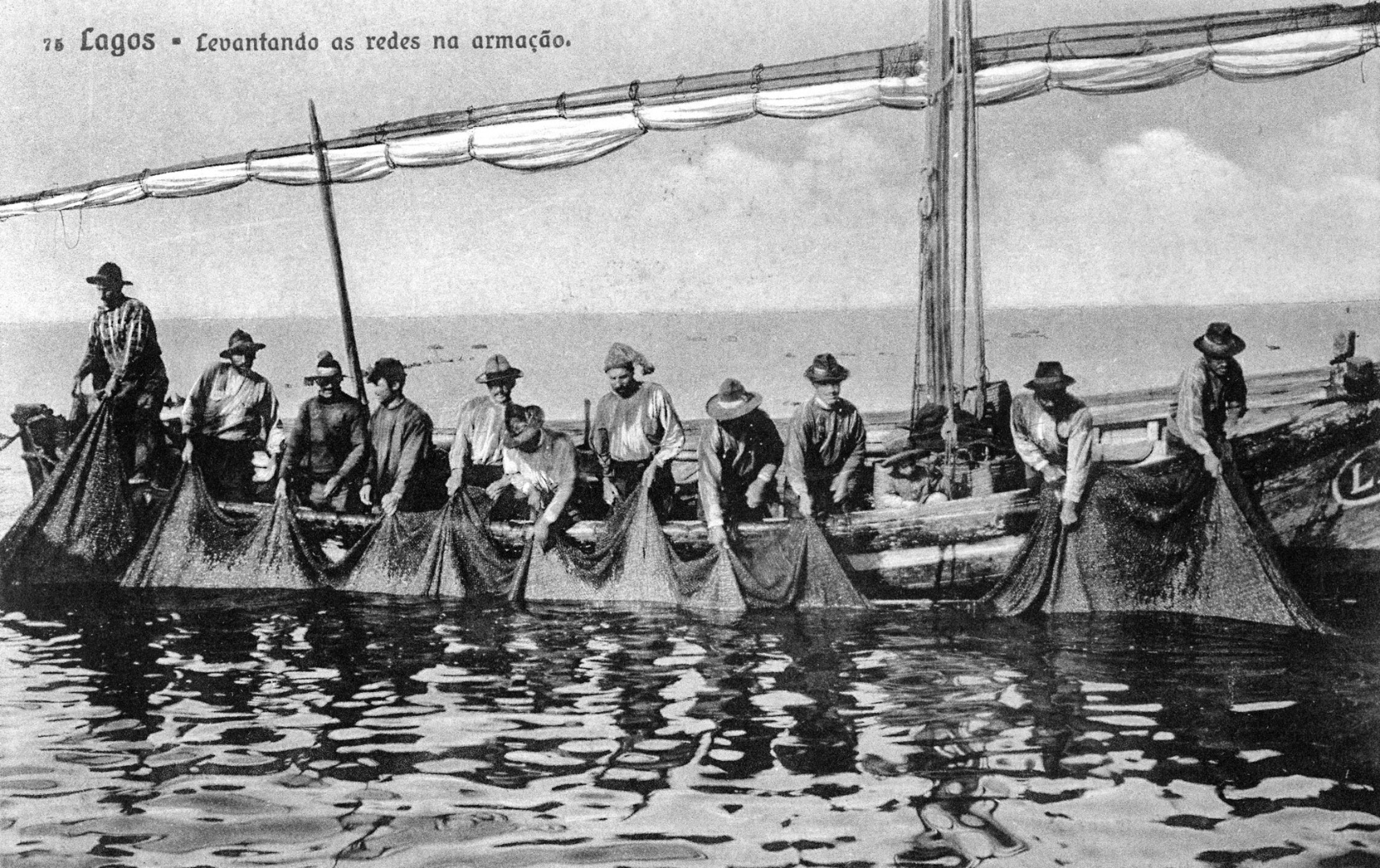 Alando redes de cerco, em inícios do séc XX. Sobre embarcações de pesca em Lagos no início do século XX, um apontamento de José Carlos Vasques: «A barca da armação, provida de vela latina fora construída e aperfeiçoada ao longo de anos e, embora preparada para recurso aos remos no caso de não haver vento, foi sem dúvida a vela que mais celebrizou este tipo de embarcação, capaz de navegar tanto à bolina cerrada como à trinca, isto é, com o vento quase de proa. Muito valia, como é óbvio, a mestria dos pescadores que com estes barcos lidavam. O formato do seu casco, um abaulado quase chato, tem explicação na necessidade de vará-los nas praias, onde se situavam os arraiais das armações ou quando os vendavais assolavam a costa, ou ainda quando demandavam a lota de Lagos onde se procedia à venda do peixe, na sua quase totalidade capturado nas armações de Lagos e Sagres. Ora, a barra de Lagos não dava entrada na maré baixa, a qualquer tipo de embarcações, mas estas barcas, com estes cascos, melhores possibilidades tinham de entrar, mesmo com risco de em marés baixas ficarem em seco.