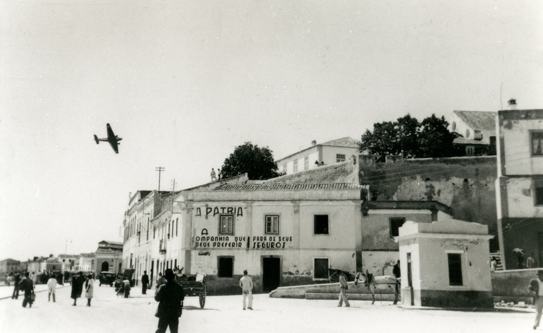 Outubro de 1952. Parte do Largo das Portas de Portugal, Rua da Capelinha e Rua Porta de Portugal, com avião Junkers JU-52 pilotado pelo lacobrigense Major José António de Almeida Costa Franco, da recém-criada Força Aérea Portuguesa, resultado da fusão, em 1 de Julho desse ano, das aviações do Exército (Aeronáutica Militar) e da Marinha (Aviação Naval). Fotógrafo desconhecido, colecção de José Paula Borba