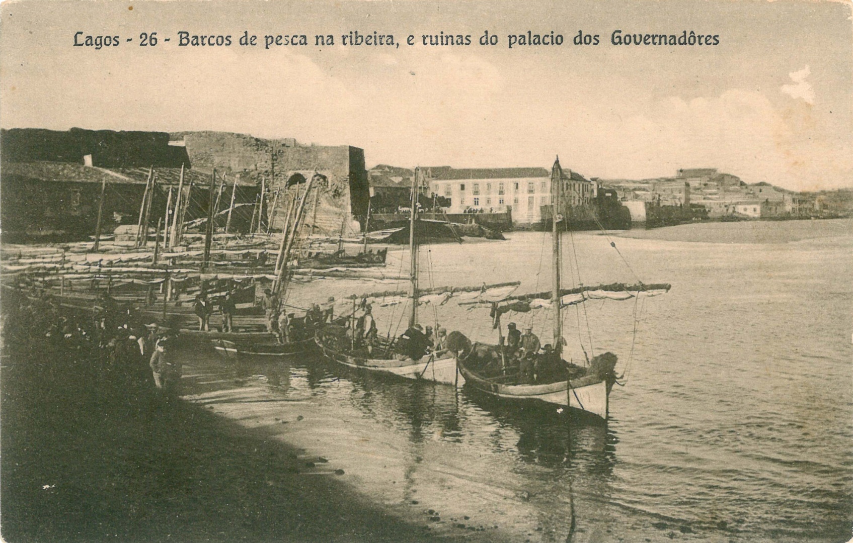 Barcos de pesca na Ribeira e ruínas do palácio dos governadores, em inícios do séc. XX, exemplar circulado com carimbo de correio de 1930.