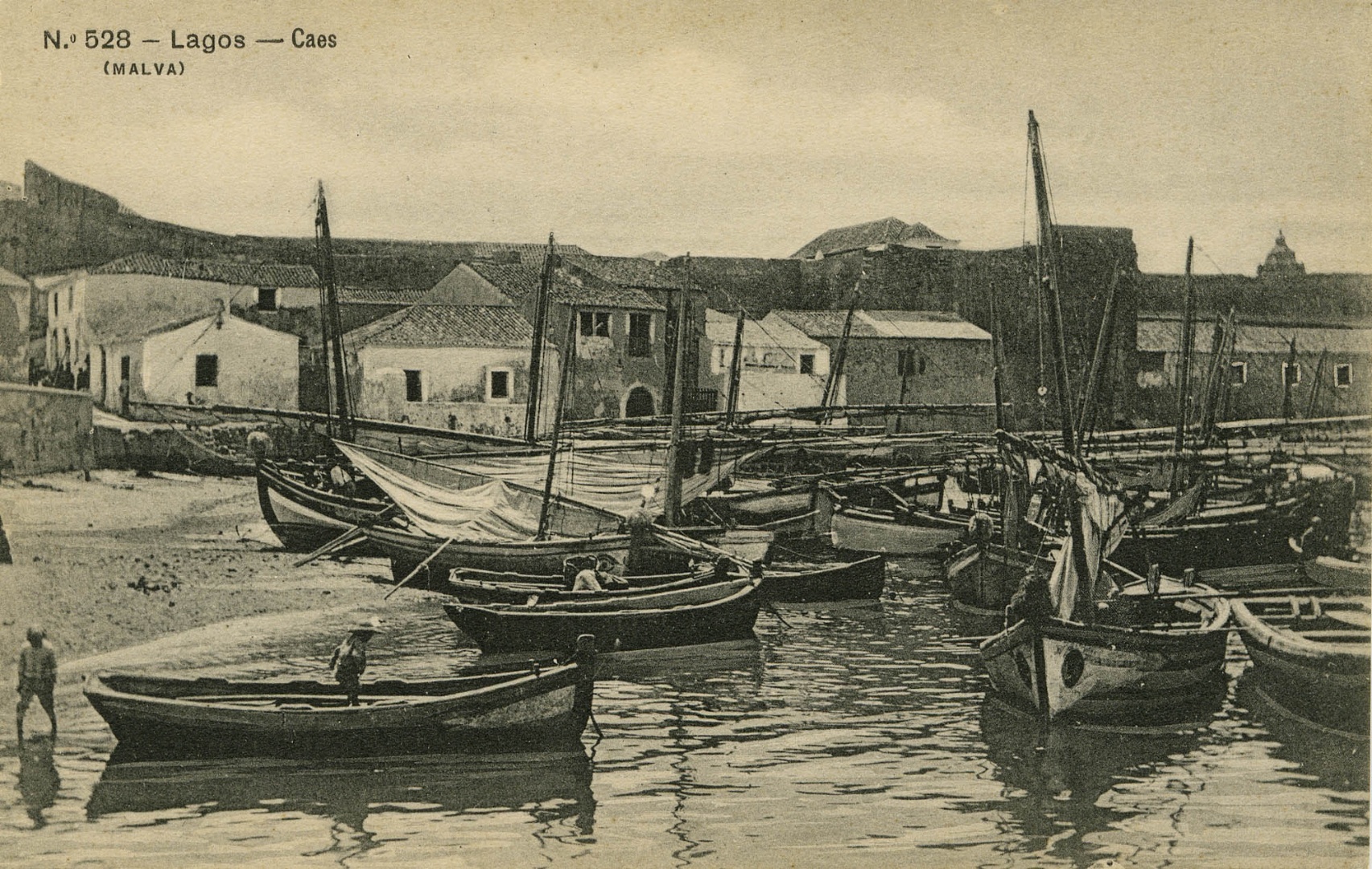 Praia da Ribeira com barcos em 1905/6. Local onde se procedia à descarga de pescado. No limite esquerdo observa-se a base do cunhal do Forte Ponta da Bandeira. Este local corresponde hoje à doca adjacente ao Forte, inaugurada em 1960 no âmbito das comemorações henriquinas.