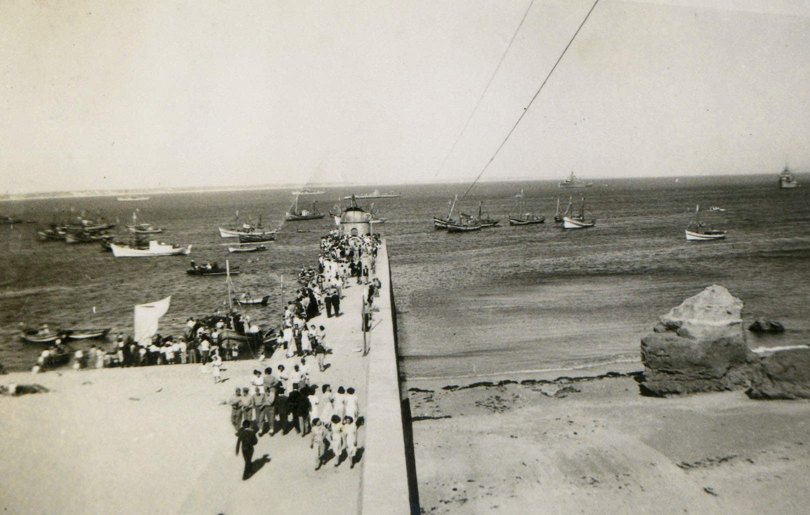 Cais da Solaria com marégrafo, embarcações de pesca e navios fundeados na baía. Aspecto do movimento na zona ribeirinha no dia 7 de Agosto de 1960, durante as comemorações do 5º centenário da morte do Infante D. Henrique. Foto de Joaquim Silva, colecção de Mário Silva.