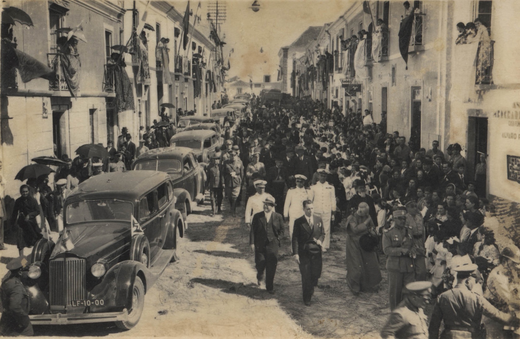 Rua Direita em 15 de Junho de 1940 durante as comemorações dos 800 anos da Fundação de Portugal (1140) e dos 500 anos da Restauração da Independência (1640). Ao centro, de chapéu na mão, o Ministro da Marinha Capitão-de-fragata Manuel Ortins Torres de Bettencourt representando o general Carmona, Presidente da República; ao lado o Ministro das Colónias Dr. Francisco José Vieira Machado representando o Presidente do Conselho de Ministros Dr. Oliveira Salazar; à frente, fardado, o Vice-Presidente da Câmara Municipal de Lagos, tenente João Amado da Cunha, representando o Município de Lagos na ausência do Presidente da Câmara Francisco Gonçalves Correia Velhinho. Veem-se ainda dois dignitários da Igreja, um seguindo ao lado do Ministro da Marinha e cumprimentando o povo – e outro entre os oficiais do exército, atrás dos oficiais da marinha. Conhecendo-se a presença do prelado algarvio, D. Marcelino Franco, e do arcebispo de Évora D. Manuel Mendes da Conceição Santos depreende-se que algum deles representava o Cardeal Patriarca de Lisboa D. Manuel Gonçalves Cerejeira, igualmente ausente nas comemorações algarvias das efemérides centenárias.