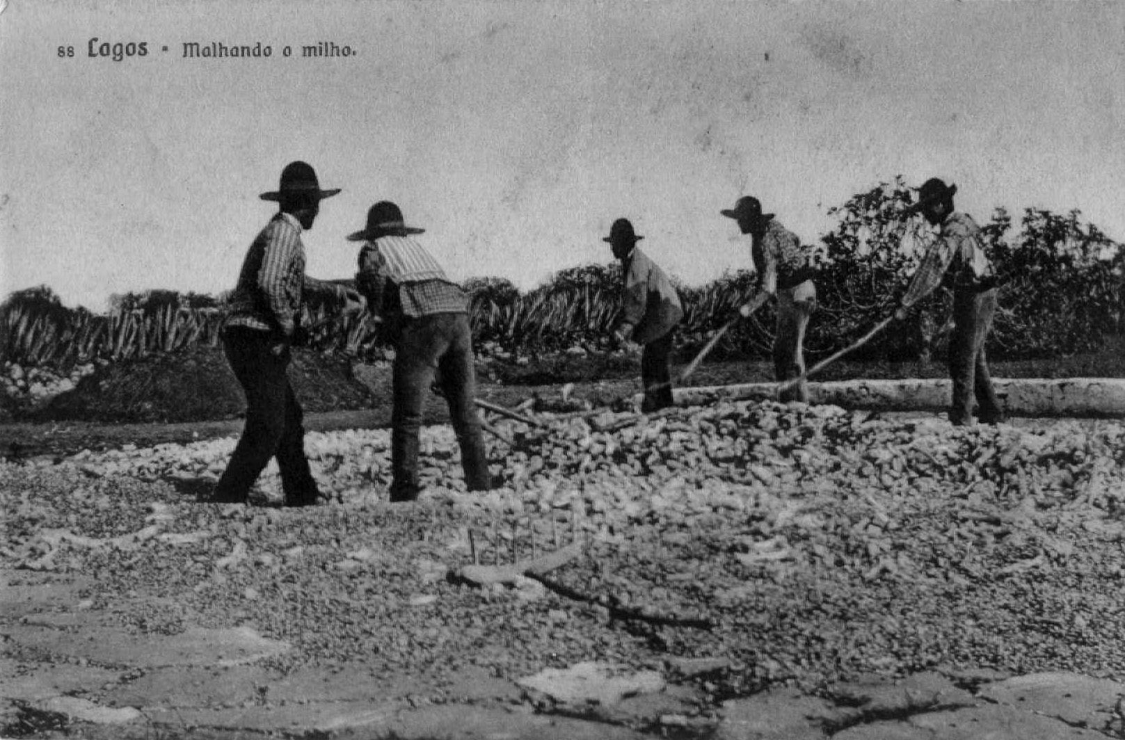 Debulha com mangal, em inícios do séc. XX - Debulhar: Tirar da espiga os grãos de cereal. Antes da proliferação das debulhadoras mecânicas na nossa agricultura, que ocorreu por volta de meados do século XX (embora tenham sido introduzidas nos anos 80 do séc XIX, na sua versão a vapor), a debulha era feita a mangal, pelo pisar do gado, ou recorrendo ao trilho. A debulha feita a pés de gado (bovino, cavalar, muar ou asinino) realizada sobre a eira (calcadouro) onde estava espalhado o cereal, era feita pelos animais ligados em linha por uma corda formando uma “cobra”. Outro processo de debulha era o que empregava o trilho, puxado por uma parelha de muares ou cavalgaduras. O trilho era um aparelho composto por um quadro com vários rolos móveis equipados com pequenas lâminas dispostas perpendicularmente ao eixo longitudinal do aparelho. A sua movimentação sobre o cereal espalhado na eira estroçava as espigas e os colmos, efectuando-se deste modo a debulha. Terminada a debulha procedia-se à desempalhagem do cereal, com os trabalhadores munidos de forquilhas que o lançavam ao ar para que o vento separasse a palha, mais leve, do grão, mais pesado. Não havendo vento o grão era separado da palha com o auxilio de uma joeira.