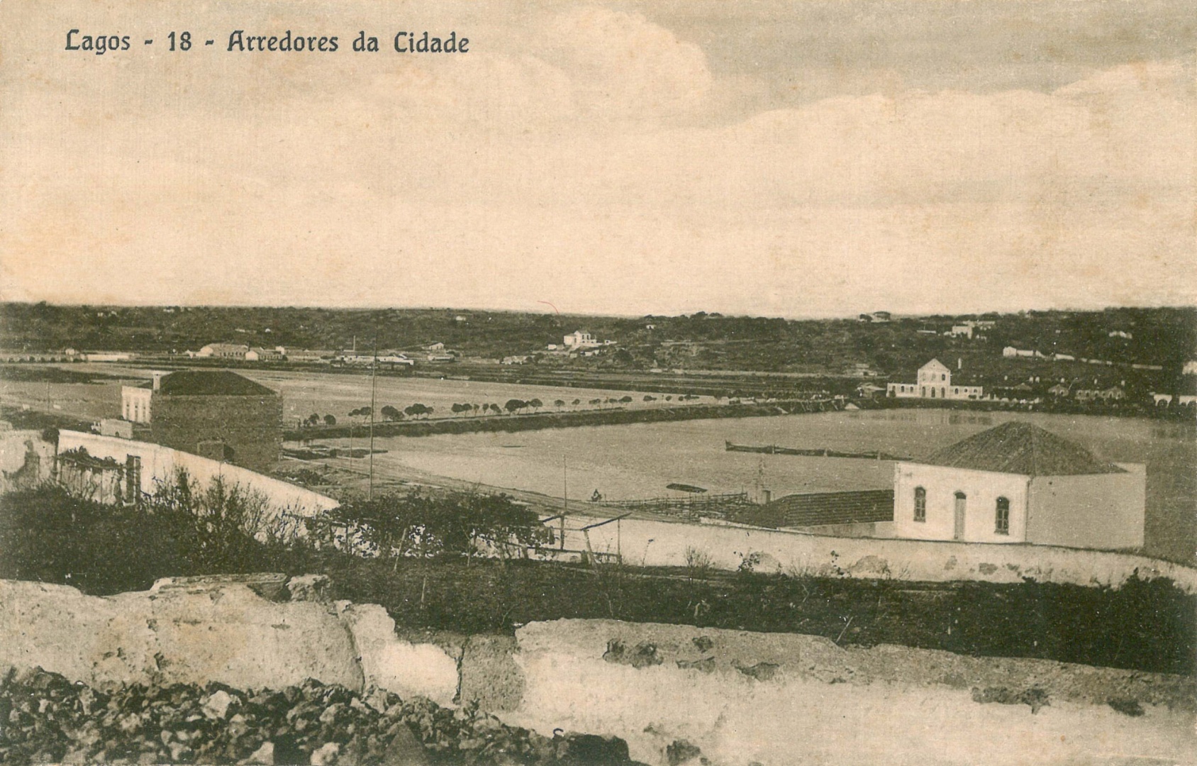 Trecho do estuário da Ribeira de Bensafrim, com estrada de acesso à Estação do caminho-de-ferro, ca. 1916, já existindo a ponte em madeira construída em 1914, a qual foi substituída ca. 1926 por uma de arcos positivos, em alvenaria; e esta seria substituída em 1959 por uma ponte de tabuleiro com quatro pilares, edificada no âmbito das obras de construção da Avenida dos Descobrimentos, verificando-se que o caudal principal do rio passou a correr pela sua margem direita. Registo efectuado a partir do Largo da Porta do Postigo (Torrinha).