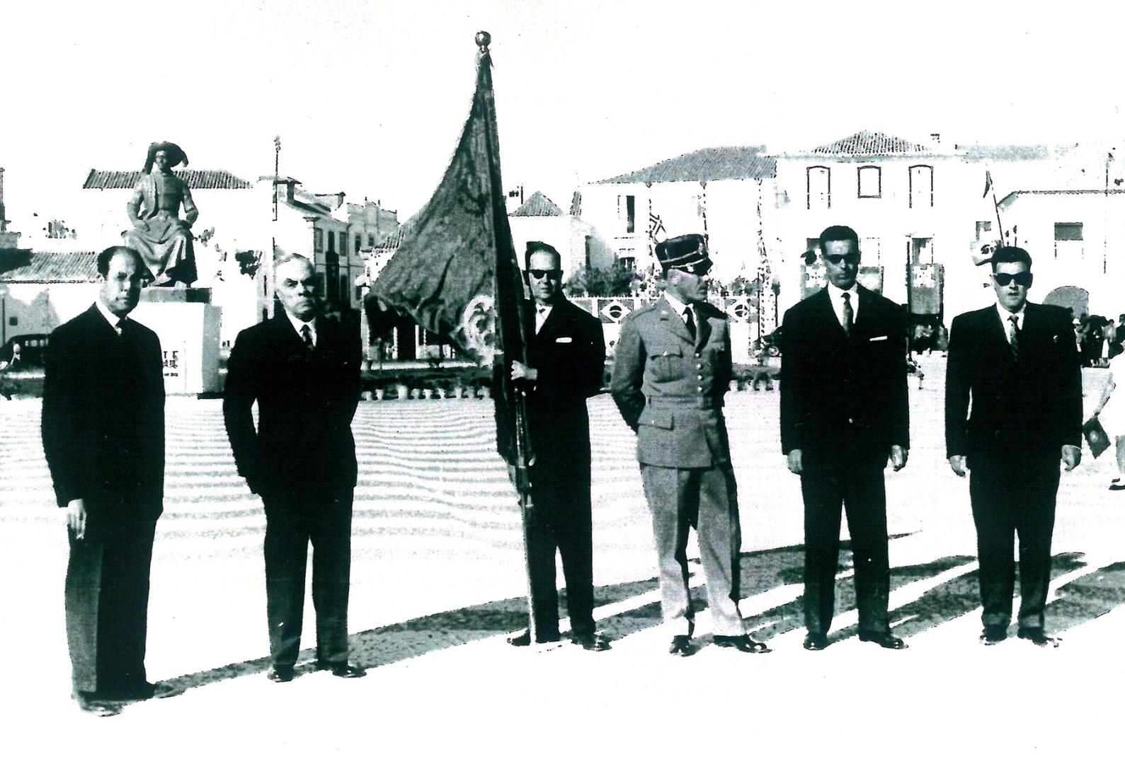 7 de Agosto de 1960 – Comissão de recepção da comitiva presidencial para as comemorações henriquinas em Lagos (inauguração da Avenida dos Descobrimentos e estátua ao infante D. Henrique). Da esquerda para a direita: Olegária da Encarnação (Vereador); José Ferreira Canelas (Presidente da CML); Duval Estrela Pestana (Secretário Municipal, portando a bandeira); Alferes Hermenegildo Fragoso (comandante da Secção da Guarda Fiscal); Manuel da Glória Santos (comandante dos Bombeiros Voluntários de Lagos), e Manuel Correia Abreu (professor e Delegado Escolar).