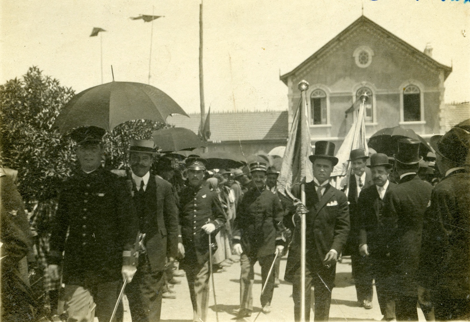 Entidades civis e militares integrando cortejo de inauguração do ramal de Lagos da Linha do Algarve após chegada do comboio à estação de Lagos, em 30 Julho de 1922. Estação de Lagos em fundo.