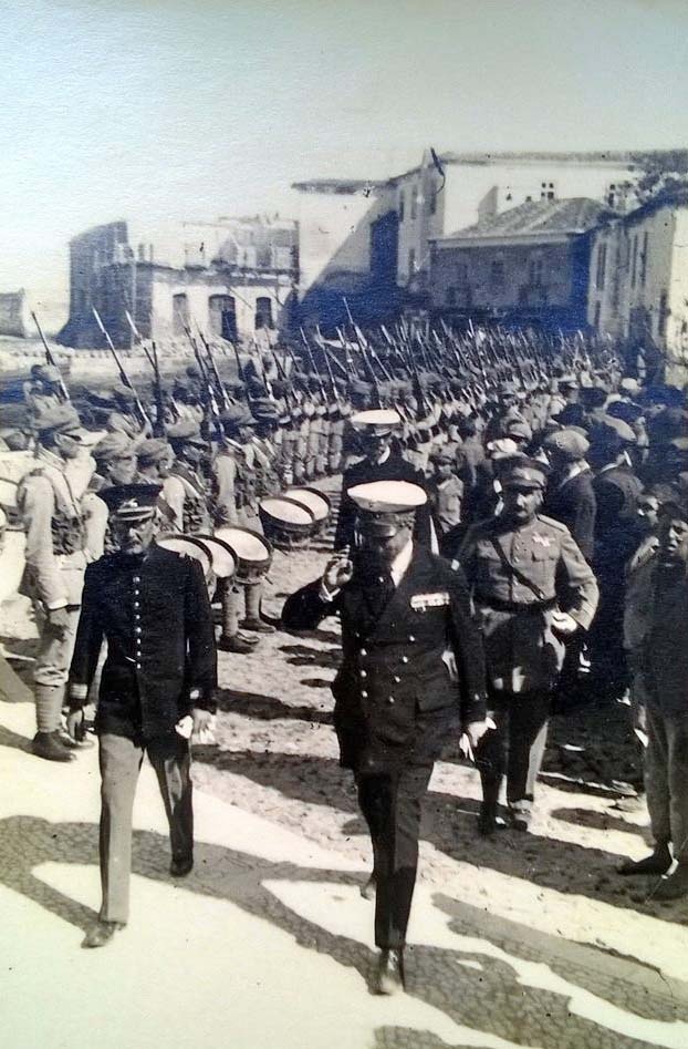 Um Vice-Almirante acompanhado de altas patentes do exército e da marinha dirige-se para o edifício do comando militar. Ao fundo, encontra-se em obras o edifício adossado ao alcácer do Castelo dos Governadores, e que funcionou como entreposto da Royal Navy desde 1903, o qual vai ser acrescido de dois pisos onde funcionará, nas décadas seguintes, o hospício anexo ao Hospital da Misericódia. Foto de: José Borlinha, 5 de Junho de 1929. Colecção de João Torres Centeno