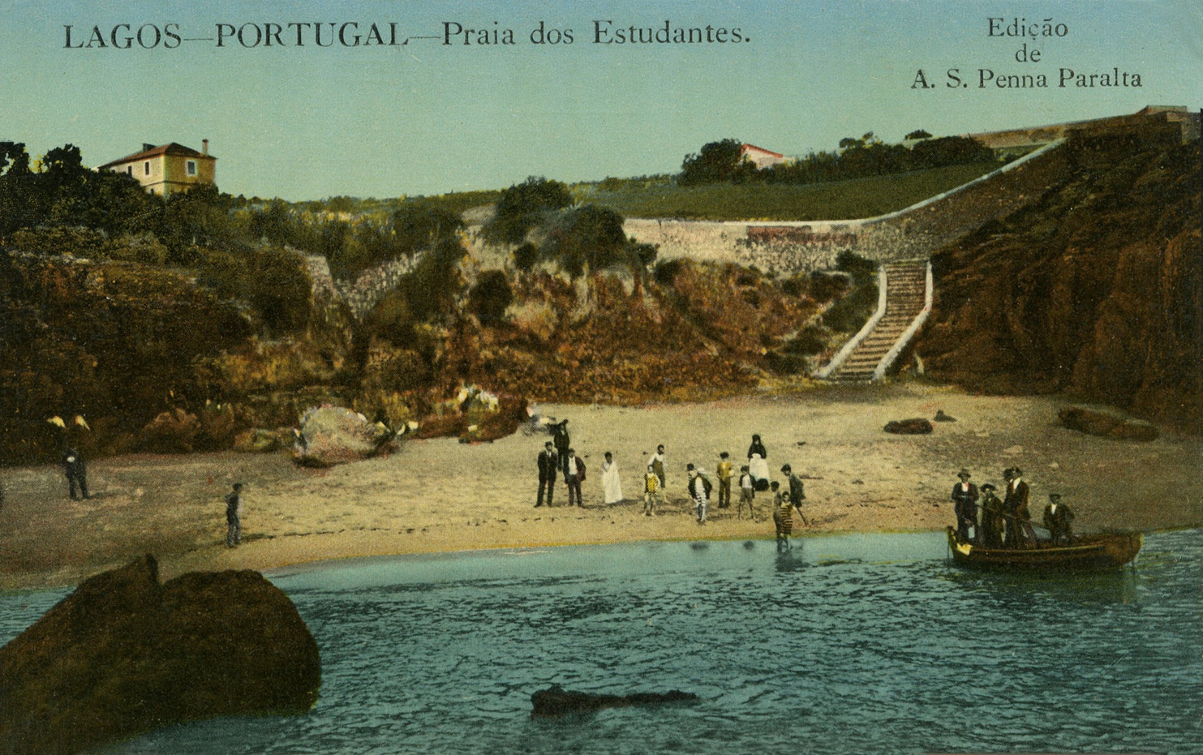 Postal colorido da Praia dos Estudantes em edição de António da Silva Penna Peralta, sobre cliché de edição monocromática anterior de autor desconhecido, circulada em 1918.