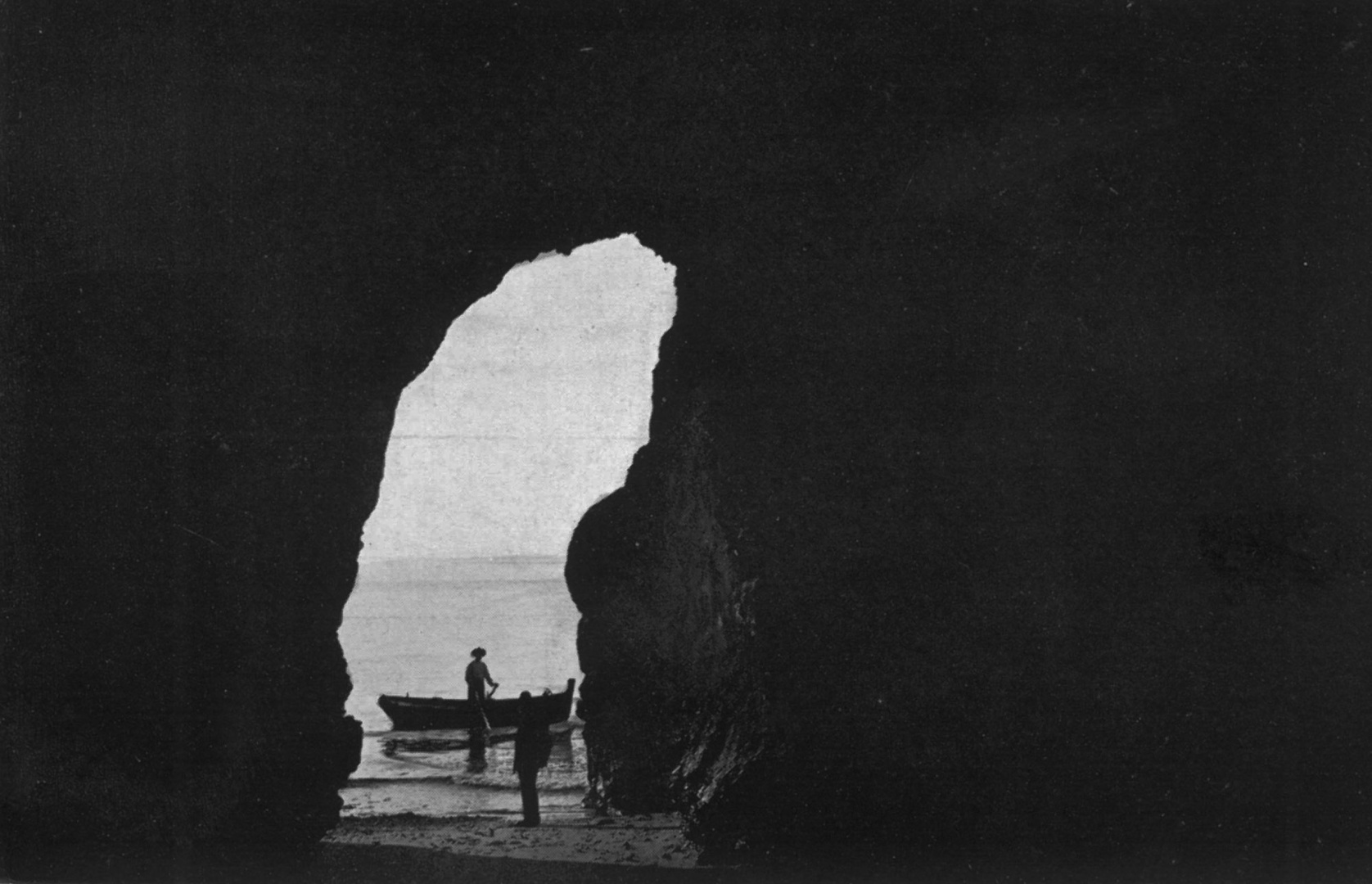 Barco junto a um arco de rocha na Costa D'Oiro durante a baixa-mar. 1931/32