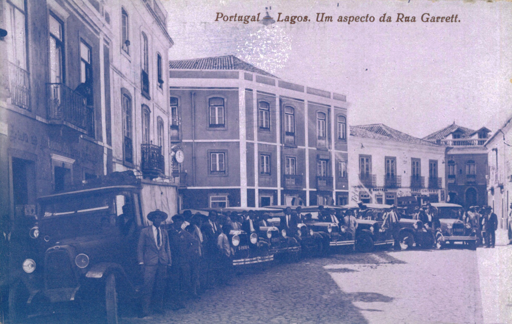 O homem de chapéu, à esquerda, é o senhor Reis, concessionário dos carros de praça (frota na imagem) e que foi, também, motorista da carreira de Sagres. Curiosidades: o candeeiro de iluminação pública, suspenso a meio da rua; e o relógio na esquina com a Rua Marquês de Pombal instalado pela relojoaria de Rodrigo Raimundo Rodrigues.