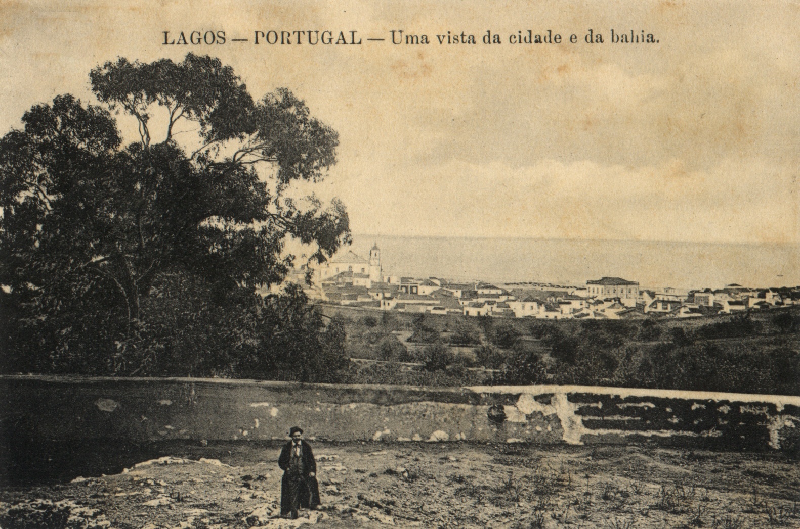 Trecho da cidade e da baía de Lagos, no início do século XX. Imagem registada a partir da zona de Santo Amaro. Cliché com várias edições, uma delas por A.S.Penna Peralta.