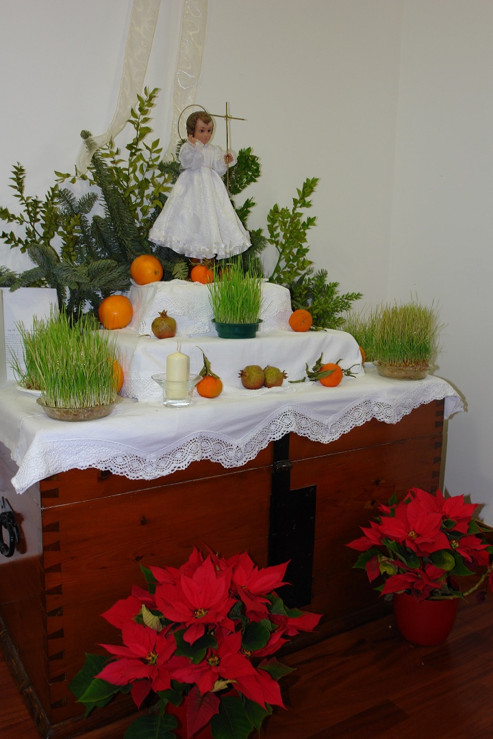 Nove dias antes do Natal, prepara-se a casa para armar o presépio ou o Trono do Menino. Sobre uma cómoda coloca-se um pequeno altar em escadaria piramidal coberto com um lençol ou toalhas de linho, com as mais lindas rendas pendendo, figurando um altar-mor de igreja. O trono é flanqueado com jarras com verdura, como a murta e o loureiro, o alecrim, a aroeira ou a nespereira. Uma característica, muito peculiar do Barrocal, é ornamentar o trono com laranjas. Ao lado do presépio colocam-se também cachos de laranjas dependurados na parede. Uma lamparina (copo com azeite e pavio de linho) era colocada num pratinho, à frente do Menino.