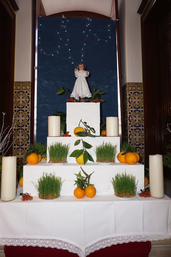 Nove dias antes do Natal, prepara-se a casa para armar o presépio ou o Trono do Menino. Sobre uma cómoda coloca-se um pequeno altar em escadaria piramidal coberto com um lençol ou toalhas de linho, com as mais lindas rendas pendendo, figurando um altar-mor de igreja. O trono é flanqueado com jarras com verdura, como a murta e o loureiro, o alecrim, a aroeira ou a nespereira. Uma característica, muito peculiar do Barrocal, é ornamentar o trono com laranjas. Ao lado do presépio colocam-se também cachos de laranjas dependurados na parede. Uma lamparina (copo com azeite e pavio de linho) era colocada num pratinho, à frente do Menino.