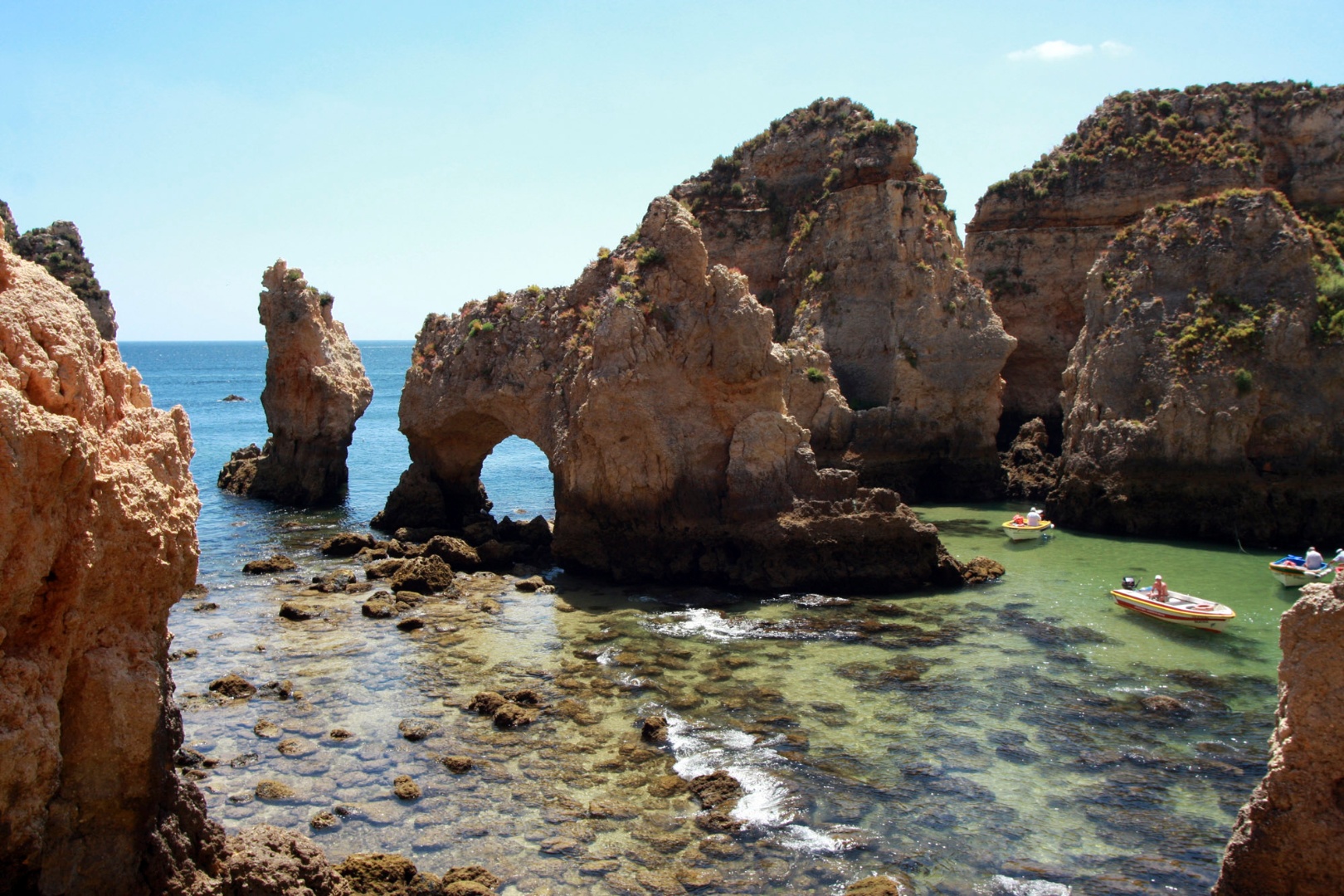 A “sala”, na Ponta da Piedade. Aqui, os visitantes encantam-se com as formas rochosas que os marítimos lacobrigenses cedo baptizaram com nomes sugestivos: “boneca”, “gigante”, “sapato”, “cozinha”, etc. Aqui se podem admirar, recorrendo a um passeio de barco, pequenas enseadas de areias doiradas e impressionantes furnas e chaminés escavadas pelo mar.