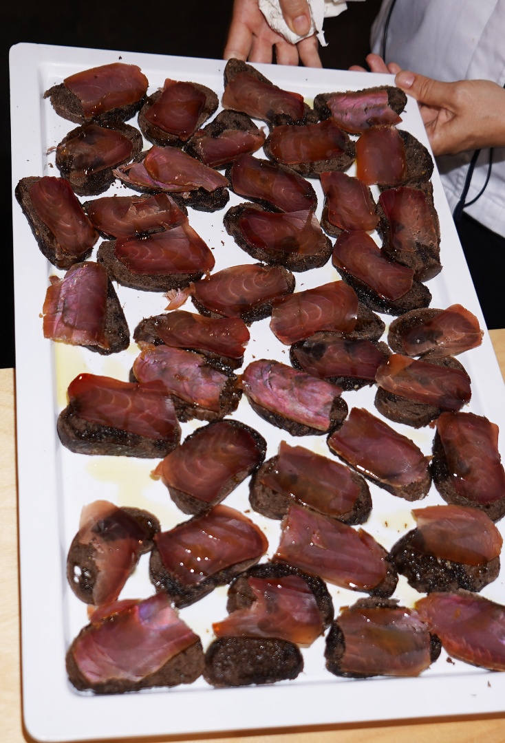 A Muxama é feita de peças lombares de atum, seco e salgado, de consistência rígida e textura suave. A muxama é intensa, salgada, com notas fumadas, alguma oleosidade e de sabor relativamente forte.