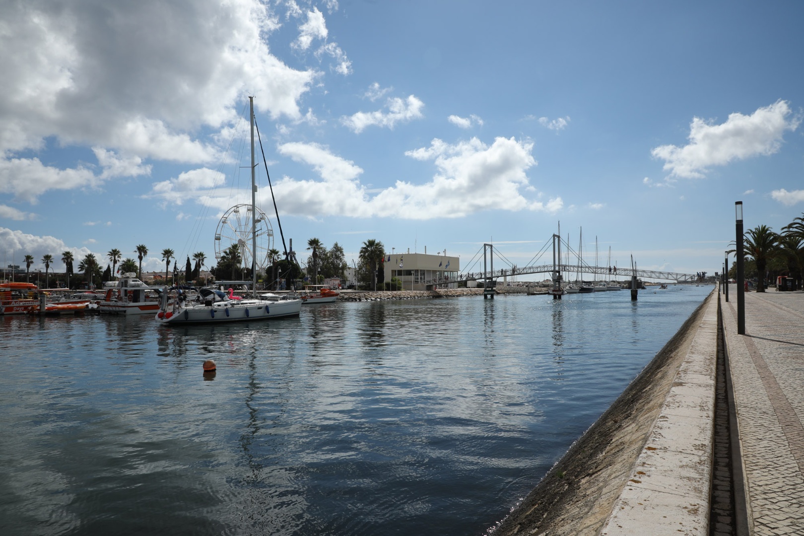 Trecho do rio com barcos, ponte pedonal e edifício administrativo da Marina de Lagos.