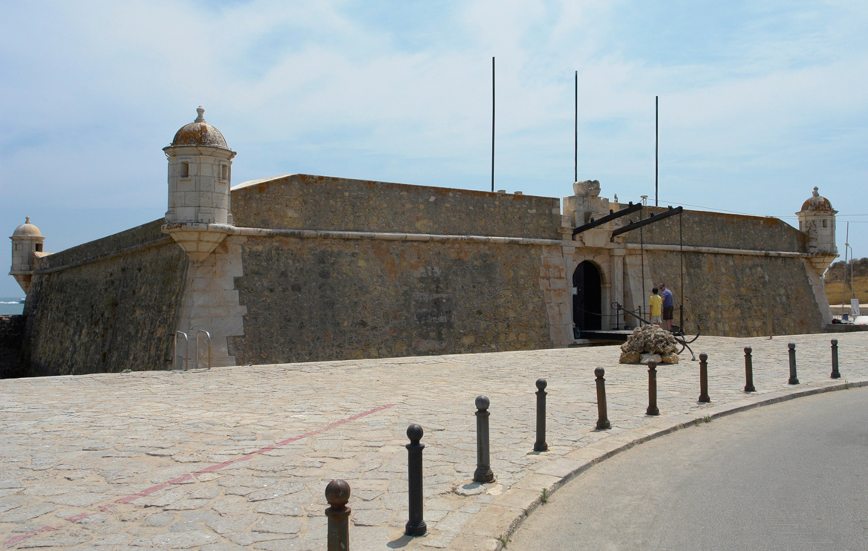 Forte de Nossa Senhora da Penha de França, ou Forte Ponta da Bandeira, também referido como Forte do Pau da Bandeira ou Forte do Registo. Construído entre 1680 e 1690, defendia o acesso ao cais e os flancos sudeste e nascente da muralha da cidade, cruzando fogo com outros baluartes existentes nas proximidades. Ao tempo, terá sido uma das fortalezas algarvias tecnicamente mais avançadas. A planta quadrangular, os volumes relativamente baixos e as paredes muito grossas nas secções viradas ao mar, evidenciam uma arquitectura militar idealizada para aproveitar a guerra de artilharia. O fosso que envolve o forte é ultrapassado por uma ponte levadiça. As actuais guaritas cilíndricas foram introduzidas durante as obras efectuadas no final dos anos 50 do séc. XX; dado que as originais, maltratadas pelo sismo de 1755, foram retiradas pelo Coronel Sande Vasconcellos em finais do séc. XVIII. No interior, conserva-se uma pequena capela seiscentista forrada a azulejos. É um dos melhores e mais bem conservados exemplares do século XVII existentes em todo o Algarve, constituindo um autêntico ex-líbris das fortificações marítimas da antiga Praça de Guerra em Lagos.