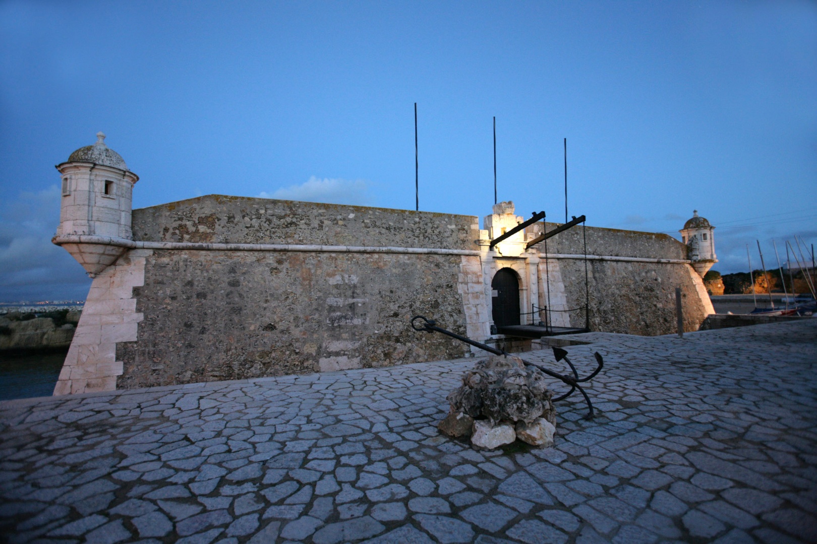 Forte de Nossa Senhora da Penha de França, ou Forte Ponta da Bandeira, também referido como Forte do Pau da Bandeira ou Forte do Registo. Construído entre 1680 e 1690, defendia o acesso ao cais e os flancos sudeste e nascente da muralha da cidade, cruzando fogo com outros baluartes existentes nas proximidades. Ao tempo, terá sido uma das fortalezas algarvias tecnicamente mais avançadas. A planta quadrangular, os volumes relativamente baixos e as paredes muito grossas nas secções viradas ao mar, evidenciam uma arquitectura militar idealizada para aproveitar a guerra de artilharia. O fosso que envolve o forte é ultrapassado por uma ponte levadiça. As actuais guaritas cilíndricas foram introduzidas durante as obras efectuadas no final dos anos 50 do séc. XX; dado que as originais, maltratadas pelo sismo de 1755, foram retiradas pelo Coronel Sande Vasconcellos em finais do séc. XVIII. No interior, conserva-se uma pequena capela seiscentista forrada a azulejos. É um dos melhores e mais bem conservados exemplares do século XVII existentes em todo o Algarve, constituindo um autêntico ex-líbris das fortificações marítimas da antiga Praça de Guerra em Lagos.