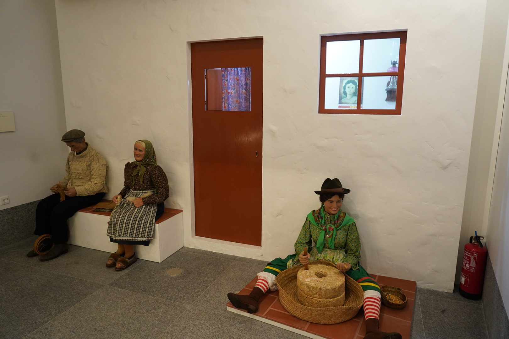 Representação de casa típica de aldeia algarvia, com homem a fazer empreita, mulher a fiar lã e jovem mulher moendo milho.