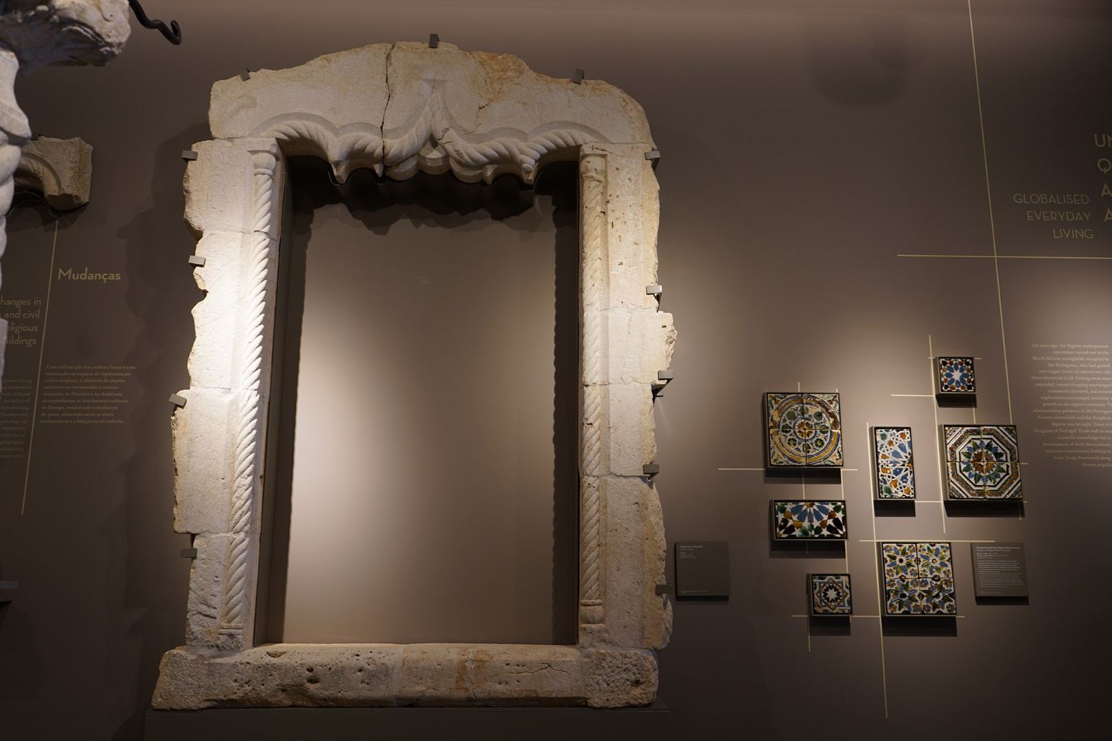 Moldura de vão de janela em calcário (séc. XVI), e azulejos hispano-mouriscos (séc. XV)