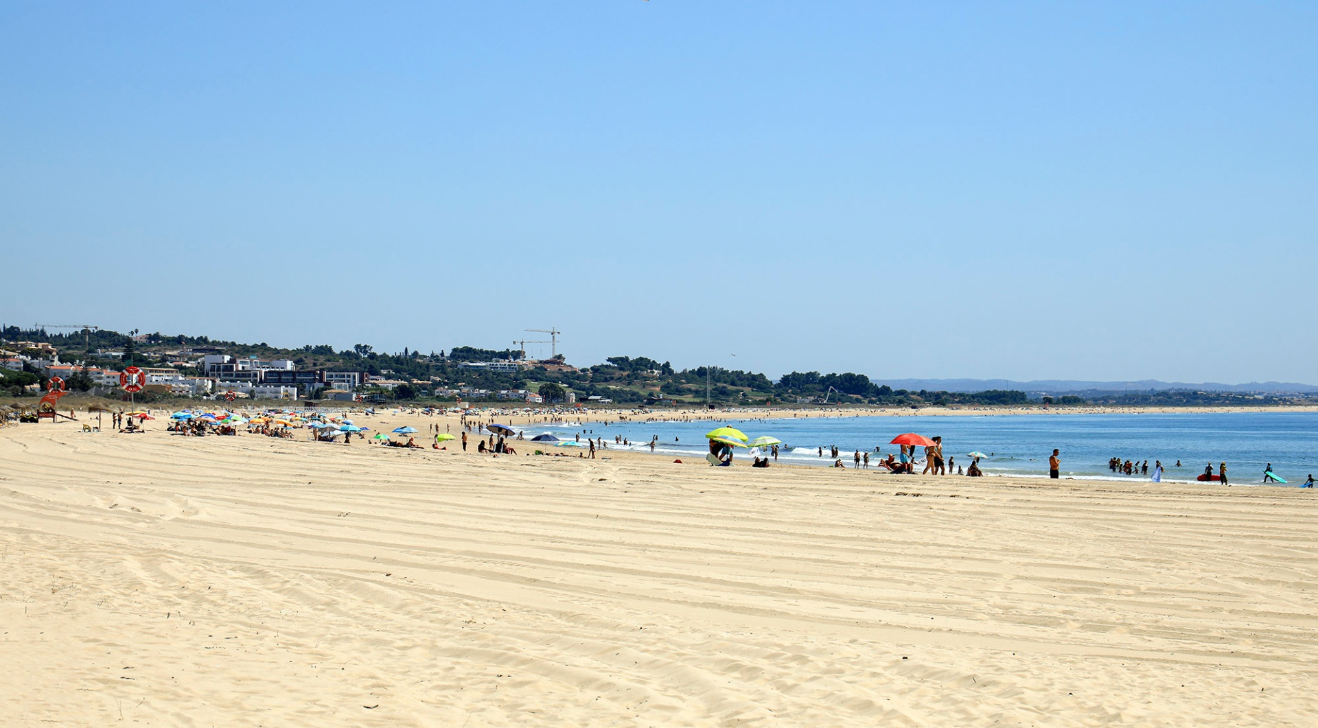 Esta praia, que segue ao longo da curvatura da baía, numa extensão de cerca de 5 quilómetros, até ao Rio de Alvor, está separada do terreno de suave declive que a envolve como um anfiteatro, por um cordão dunar de destacada beleza. A qualidade da fina areia doirada só tem paralelo nas transparentes águas que banham este magnífico trecho da costa. Ali se podem apanhar condelipas (conquilhas no resto do país) na maré baixa enquanto as crianças brincam nas bacias temporárias modeladas pelo mar junto à linha de água. Dali se podem admirar os veleiros grandes e pequenos navegando para lá e para cá, animando a baía com as suas velas brancas recortadas nos azuis do céu e do mar.