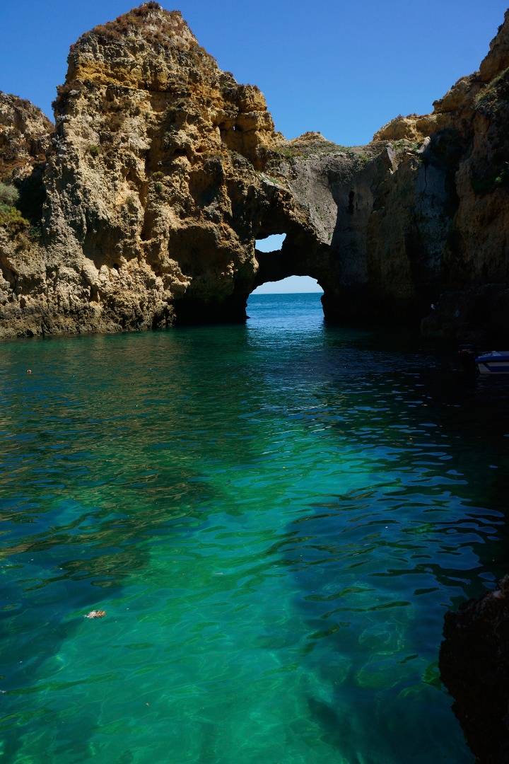 A “sala”, na Ponta da Piedade. Aqui, os visitantes encantam-se com as formas rochosas que os marítimos lacobrigenses cedo baptizaram com nomes sugestivos: “boneca”, “gigante”, “sapato”, “cozinha”, etc. Aqui se podem admirar, recorrendo a um passeio de barco, pequenas enseadas de areias doiradas e impressionantes furnas e chaminés escavadas pelo mar.