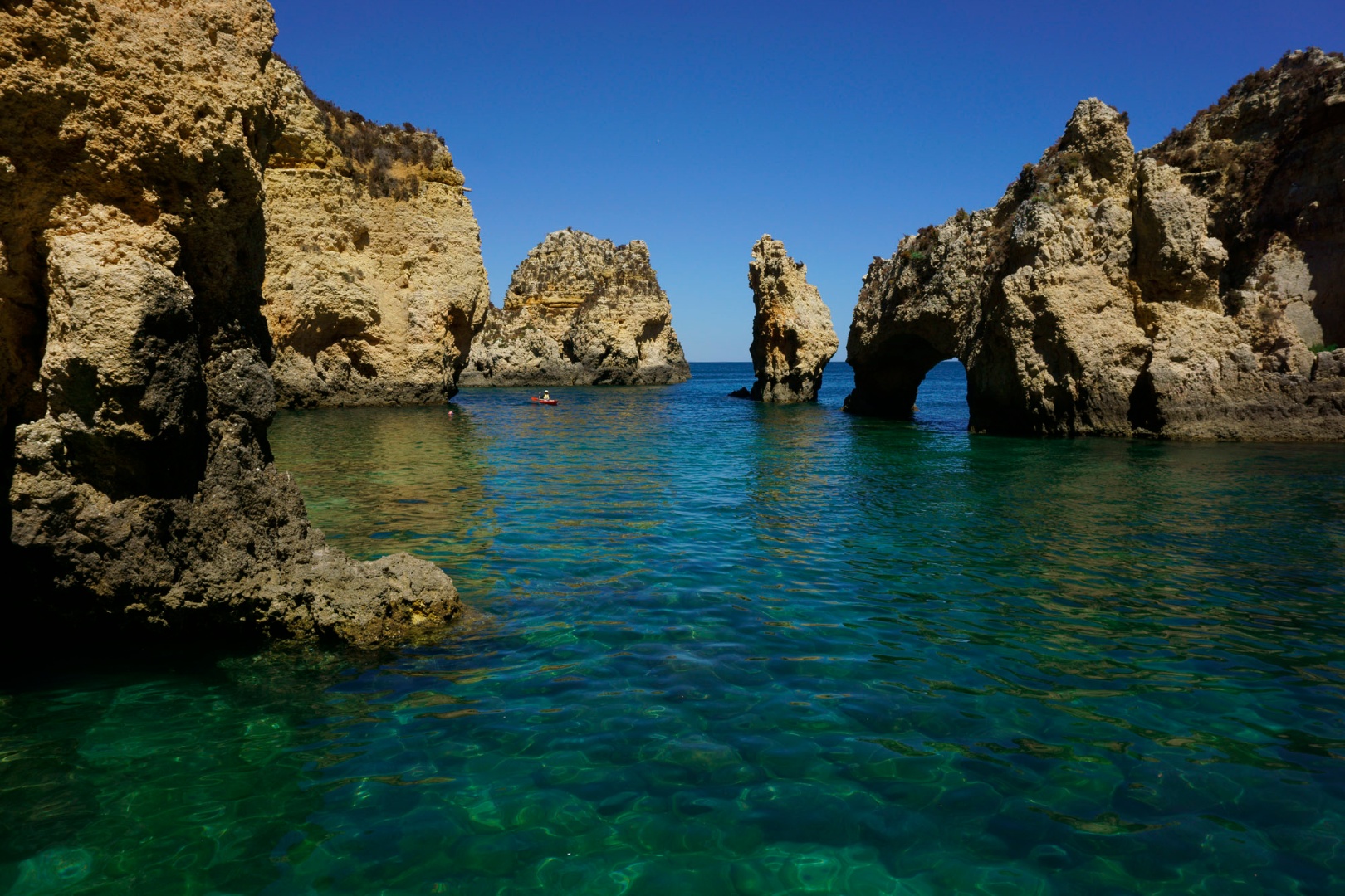 A “sala”, na Ponta da Piedade. Aqui, os visitantes encantam-se com as formas rochosas que os marítimos lacobrigenses cedo baptizaram com nomes sugestivos: “boneca”, “gigante”, “sapato”, “cozinha”, etc. Aqui se podem admirar, recorrendo a um passeio de barco, pequenas enseadas de areias doiradas e impressionantes furnas e chaminés escavadas pelo mar.