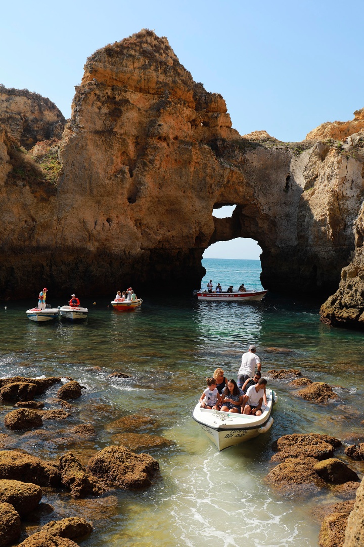 No promontório da Ponta da Piedade se podem admirar, recorrendo a um passeio de barco, pequenas enseadas de areias doiradas e impressionantes furnas e chaminés escavadas pelo mar.